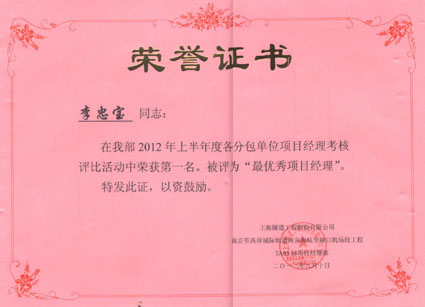 近日,在上海隧道工程股份有限公司南京至高淳城际轨道南京南站至禄口机场段工程TA05标项目经理部上半年开展的“立功竞赛评比”活动中,徐州基桩工程公司获“最优秀分包单位”荣誉,项目经理李忠宝荣获“最佳项目经理”称号。