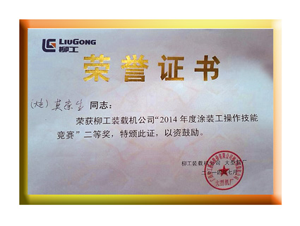 近日,在广西柳工股份机械装载机公司主办的“2014年度涂装工操作技能竞赛”中,徐州大光涂料厂柳州办事处莫崇生同志凭借扎实的理论基础和稳定的临场发挥荣获技能竞赛二等奖。