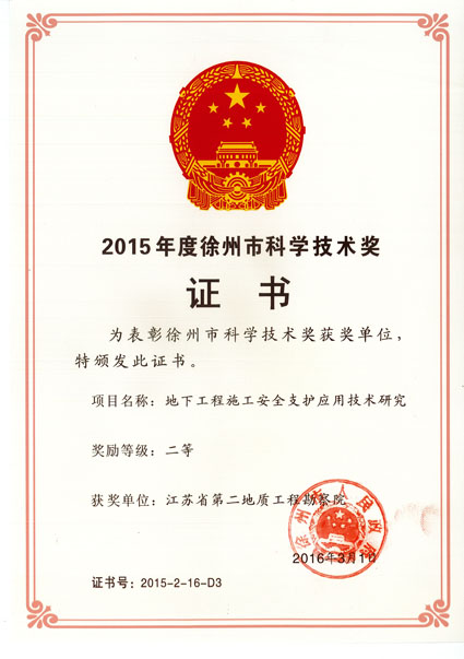 仓库》项目场地采煤斜井局部分段注浆中的实际问题,大大节约了生产成本;与江苏建筑职业技术学院共同完成的《地下工程施工安全支护应用技术研究》课题被徐州市政府评为徐州市科学技术奖二等奖。